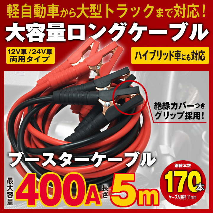 商品名 ブースターケーブル 5m 400A 12V/24V対応 商品情報 いざと言う時のマルチブースターケーブル! ● 幅広い車種に対応! 12V/24V対応 軽自動車・普通自動車・ハイブリッド車・大型トラック/トレーラー・建設機械と幅広い車種に対応しています。