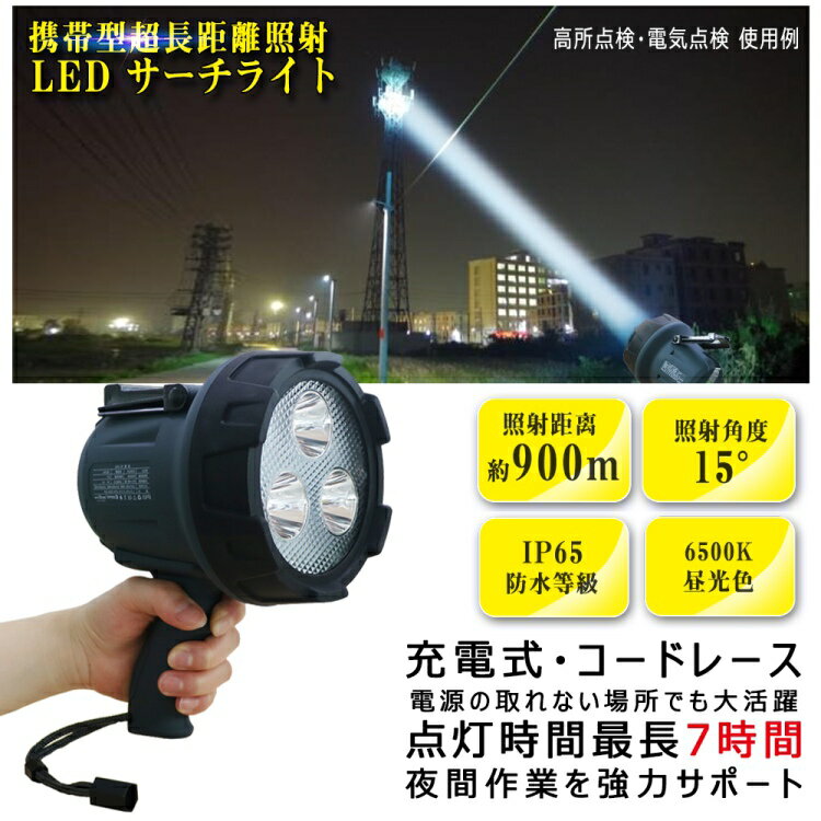 最長照射距離約900m、超遠距離タイプの登場! 光を集中させる漏斗式反射板を採用により、狭角15°配光で超遠距離900m付近まで到達!充電式・コードレース!電源の取れない場所でも大活躍!点灯時間最長8時間!夜間作業を強力サポート! 多機能設計! 折り畳み式ハンドル・グリップ・ストラップ・三脚取付穴付使用場所によって手持ち・手提げ・吊り下げが可能!市販の三脚にも対応!グリップの滑りにくく持ちやすい形状に加え、僅か0.7kgの重さで扱いやすい設計※三脚は付属しておりません。