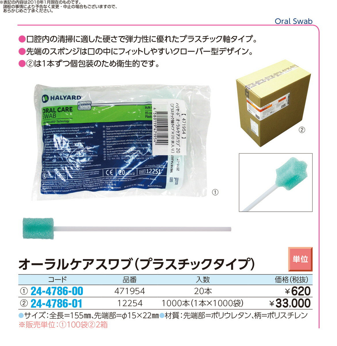 ハリヤードオーラルケアスワブ(プラ軸 471954(20ホン)品番 24-4786-00100入り 医療機器対象外 口腔ケア 口腔内洗浄 定価\62000 JAN 4580119471954 ●定価¥620円(税別)●商品説明●口腔内の清掃に適した硬さで弾力性に優れたプラスチック軸タイプ。